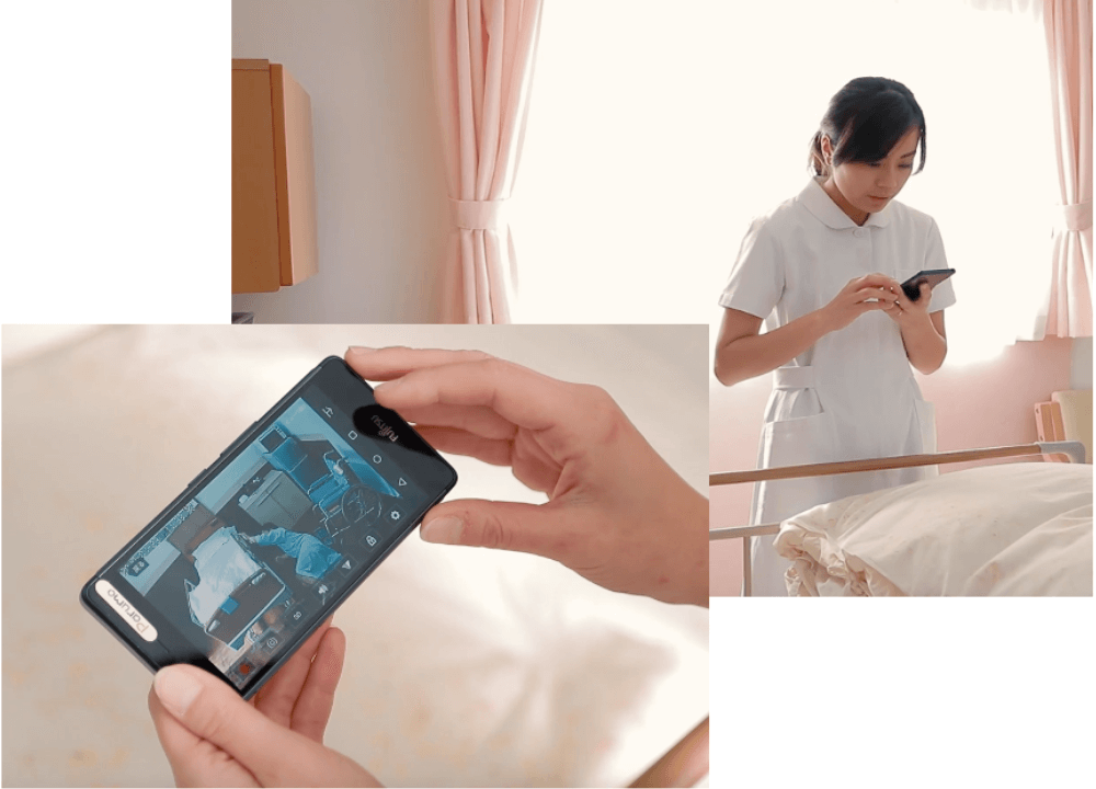 また、バイタルセンサーとの連携ができる「完全連動 バイタル24H見守り」は、リアルタイムで心拍や呼吸、体動をチェックし、異常時にはナースコールシステムと連動やスマホへの通知でいち早くスタッフに知らせるため、スタッフの負担軽減と利用者の安全確保を両立できるのです。また、万が一の事故発生時には、録画機能によって原因究明や再発防止策の検討、ご家族への説明にも活用できます。